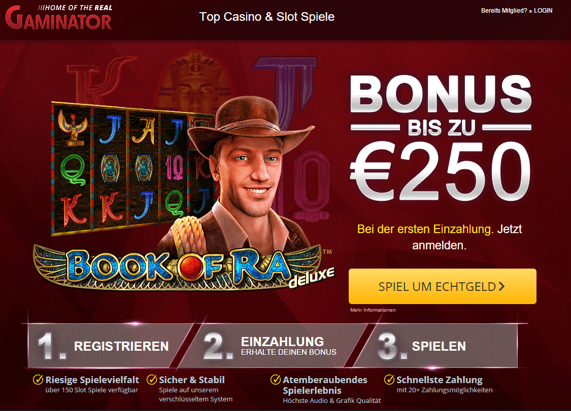 Dazu kommt ein weiterer und nicht unwichtiger Punkt: Im SuperGaminator kannst du beispielsweise Book of Ra ohne Anmeldung und zwar an einem richtigen Online Automaten und nicht an einer Flash-Werbung, bei der man lediglich bis 200 Punkte setzen darf. Es gibt 5000 Punkte Spielgeld. Teste drauflos und denk dran, dass du um richtiges Geld mit nach Hause nehmen zu können, auch eine Echtgeld-Einzahlung machen musst. Diese kannst du dir allerdings mit bis zu 250 € versüssen lassen: Denke also an SuperGaminator Bonus Code!