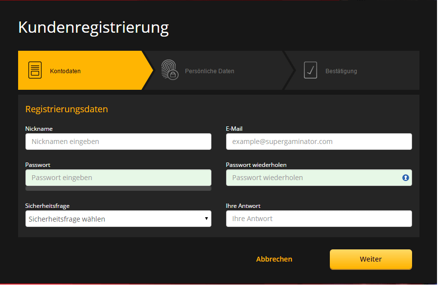 - Klicke dich weiter zum SuperGaminator und registriere dich. Du findest den Button "Registrieren" zur Anmeldung oben rechts auf der SuperGaminator Startseite. Denke an den SuperGaminator Bonus Code für den tollen Willkommensbonus!